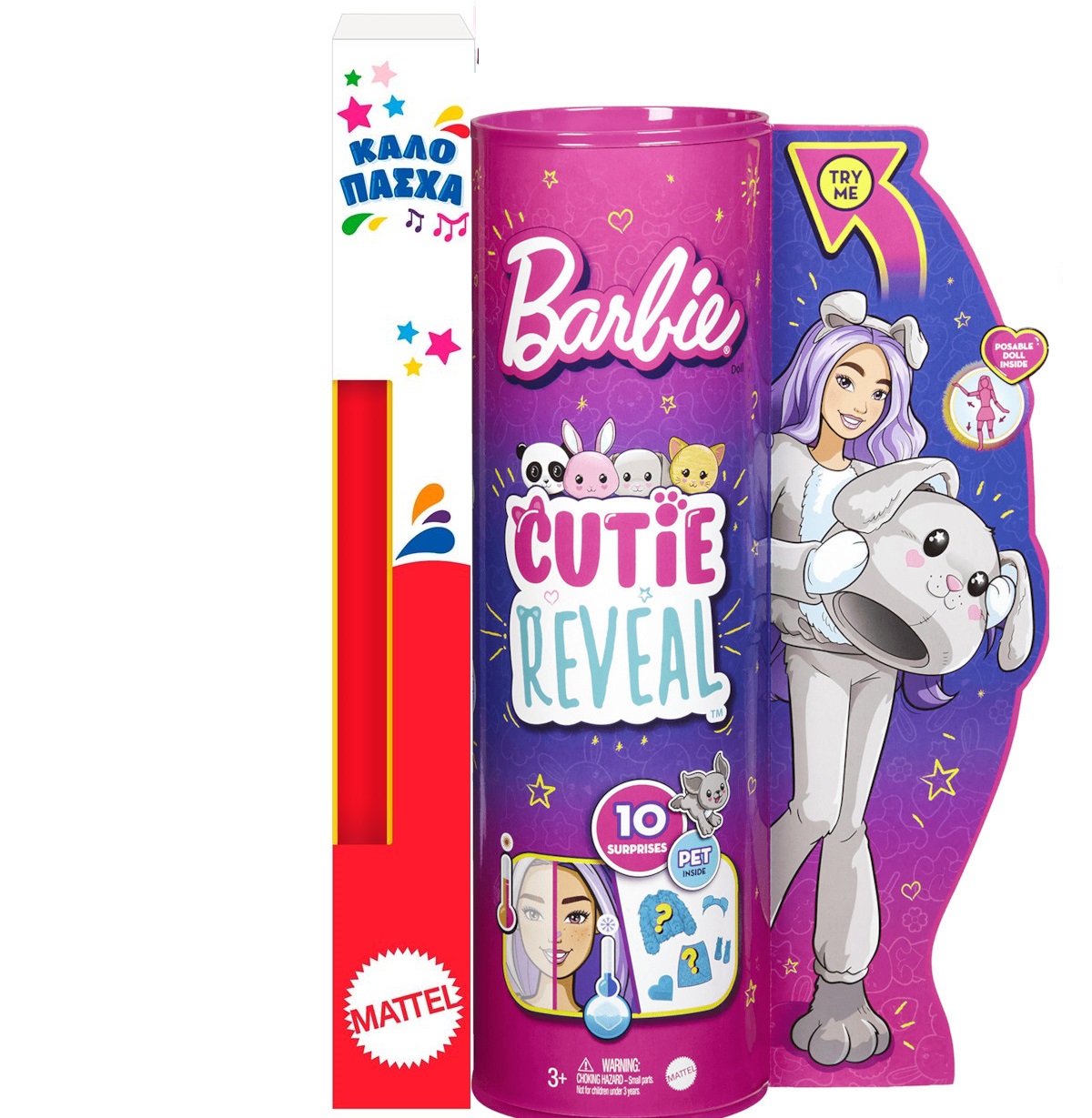 Ανοίξτε τη συσκευασία για να αποκαλύψετε ένα μαλακό σκυλάκι και τέσσερα σακουλάκια με εκπλήξεις. Αφαιρέστε τη στολή και ανακαλύψτε μια κούκλα Barbie με μακριά μαλλιά και λαμπερές λεπτομέρειες! Ανοίξτε τα σακουλάκια για να βρείτε αστραφτερά ρούχα, αξεσουάρ, μία χτένα και ένα κουταβάκι.Το επάνω μέρος της στολής αναποδογυρίζει και γίνεται ένα πολύ απαλό φλις μπουφάν, ενώ και το κεφάλι μετατρέπεται σε κρεβάτι για ζωάκι! Οι εκπλήξεις συνεχίζονται με την αλλαγή χρώματος! Στο πρόσωπο της Barbie εμφανίζονται σχέδια προσώπου ζώου και το κουταβάκι “ανοιγοκλείνει” τα μάτια του – είναι τόσο χαριτωμένο! Χρησιμοποιήστε τη χτένα και κρύο νερό για να αποκαλύψετε τα σχέδια και αλλάξτε τα πάλι με ζεστό νερό.
