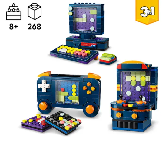 Αυτό το σετ LEGO® Creator 3 σε 1 προσφέρει στους παίκτες ηλικίας 8 ετών και άνω την απόλυτη ελευθερία επιλογής. Μπορούν να ξεκινήσουν με μια φορητή κονσόλα που διαθέτει κινούμενους μοχλούς και κουμπιά, και στη συνέχεια να την ανακατασκευάσουν σε έναν μίνι επιτραπέζιο υπολογιστή ή ένα κλασικό μηχάνημα arcade.