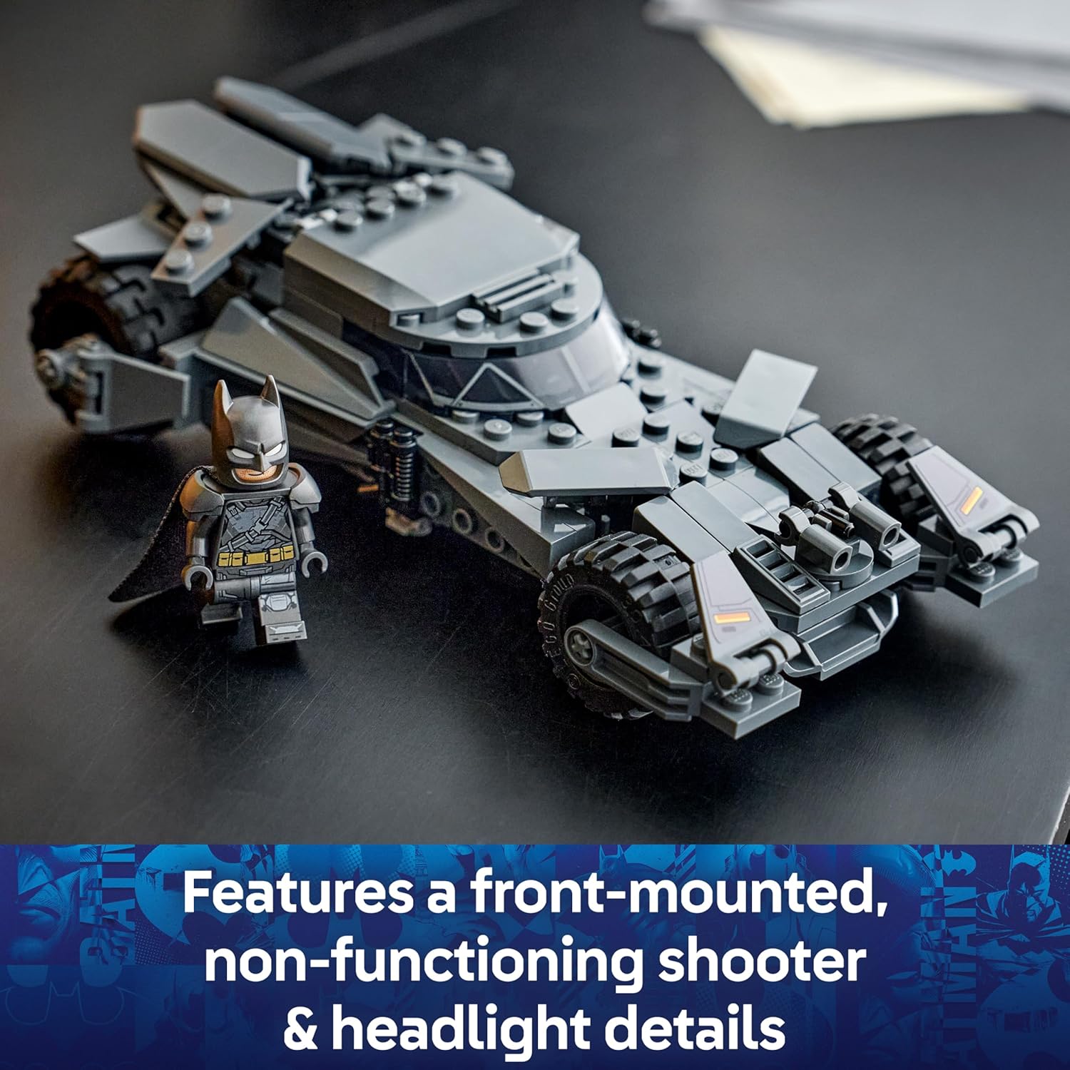 • Ένα αναμνηστικό χρυσό νόμισμα ενσωματωμένο στο εσωτερικό του Batmobile.• Λεπτομερή αυτοκόλλητα για τους προβολείς και τον εξοπλισμό του οχήματος.