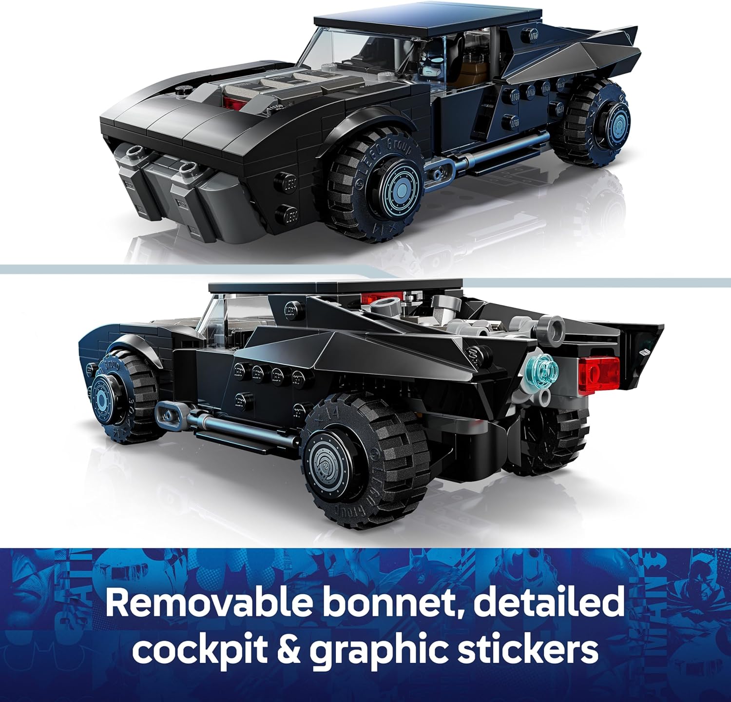 Ανακαλύψτε κάθε λεπτομέρεια αυτού του θρυλικού αυτοκινήτου, το οποίο είναι σχεδιασμένο για να εντυπωσιάζει τόσο στο παιχνίδι όσο και στη βιτρίνα σας. Διαθέτει αφαιρούμενη οροφή που σας επιτρέπει να τοποθετήσετε τη μίνι φιγούρα του Batman στο πιλοτήριο, καθώς και αφαιρούμενο καπό για να αποκαλύψετε το επετειακό χρυσό νόμισμα.