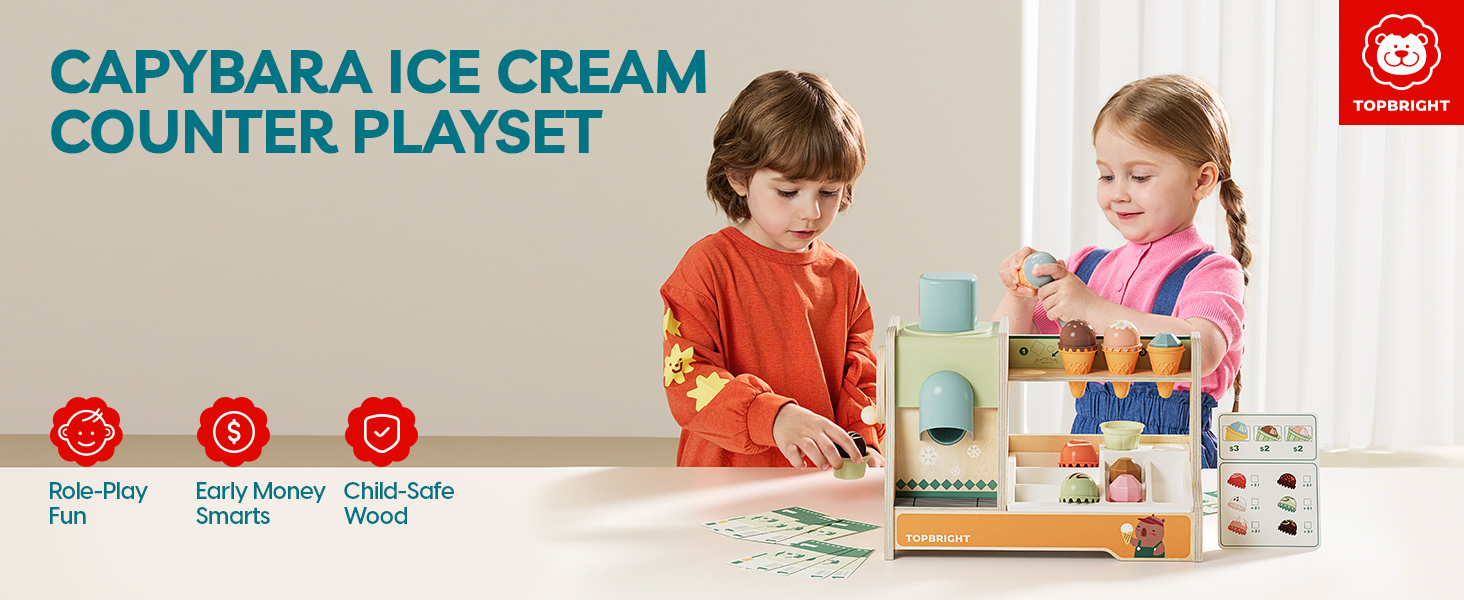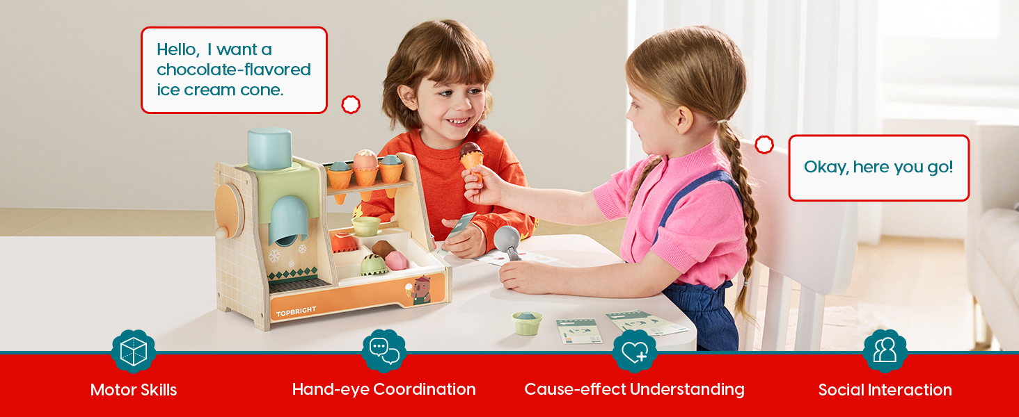 Τα παιδιά μπορούν να παίξουν τον καταστηματάρχη ή τον πελάτη με αυτό το διαδραστικό ξύλινο σετ παγωτού. Με μια λειτουργική μηχανή παγωτού, κουτάλα, ρεαλιστικές κάρτες παραγγελιών, εικονικά χρήματα και πολύχρωμα υλικά, τα μικρά διασκεδάζουν διαδραστικά ενώ παράλληλα αναπτύσσουν κινητικές δεξιότητες και πρώιμες μαθηματικές δεξιότητες. Ιδανικό για παιχνίδι μόνοι τους ή με φίλους!